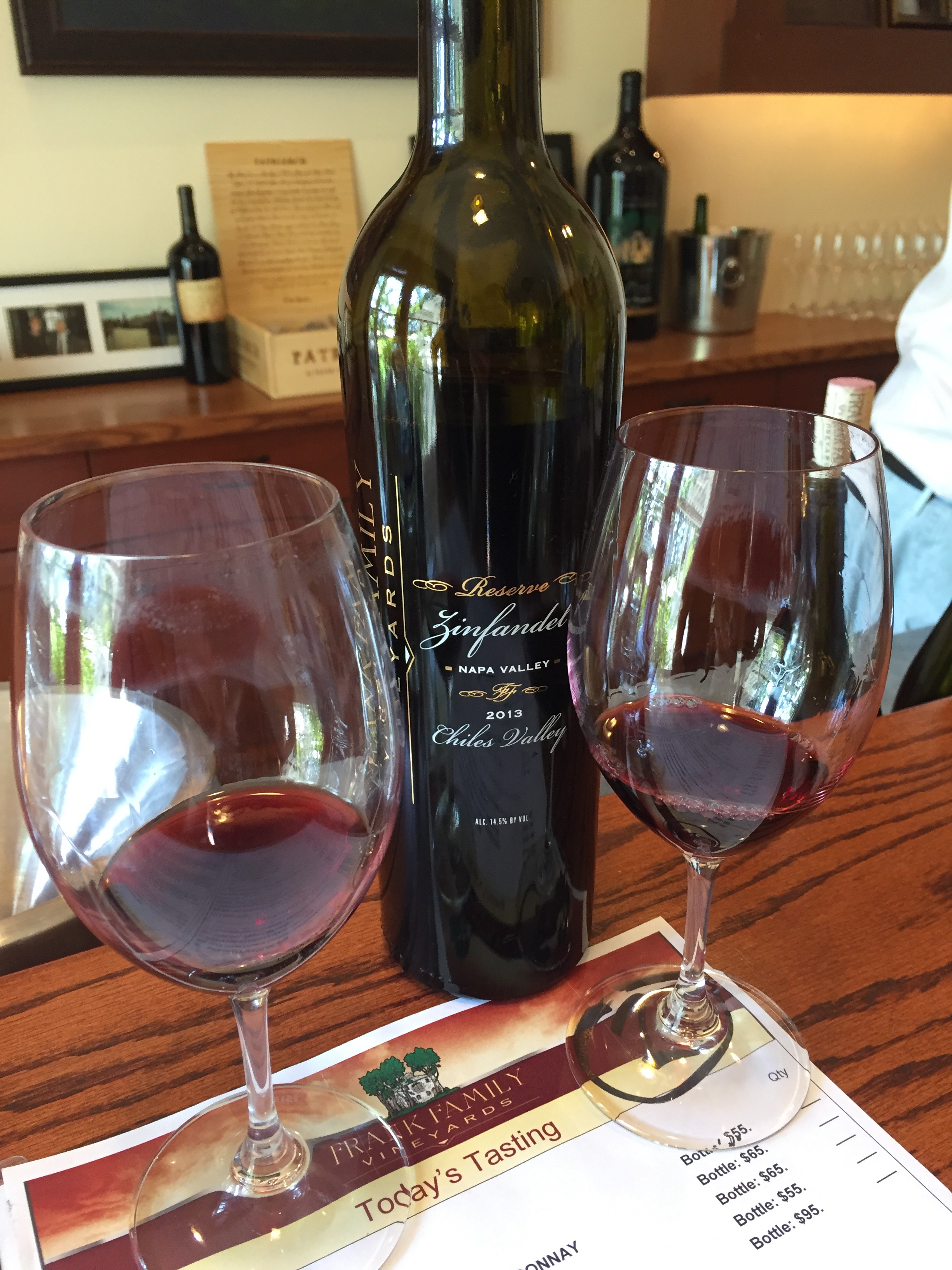 10:00 am: Our first stop was Frank Family Vineyards. We walked inside and into a side room with two bars – perfect size for about 6 people to enjoy wine at each one. Our “guide” for lack of a better word, was easy going but also very knowledgeable. We started with a sparkling wine – which was delicious! Then we had a Chardonnay followed by three red wines. My favorite was the sparkling wine, the Pinot Noir and the Sangiovese. Give yourself about an hour and a half to two hours here. It is not rushed but we made our next appointment a little too close for comfort. We ordered our Uber and were off to the second winery!
