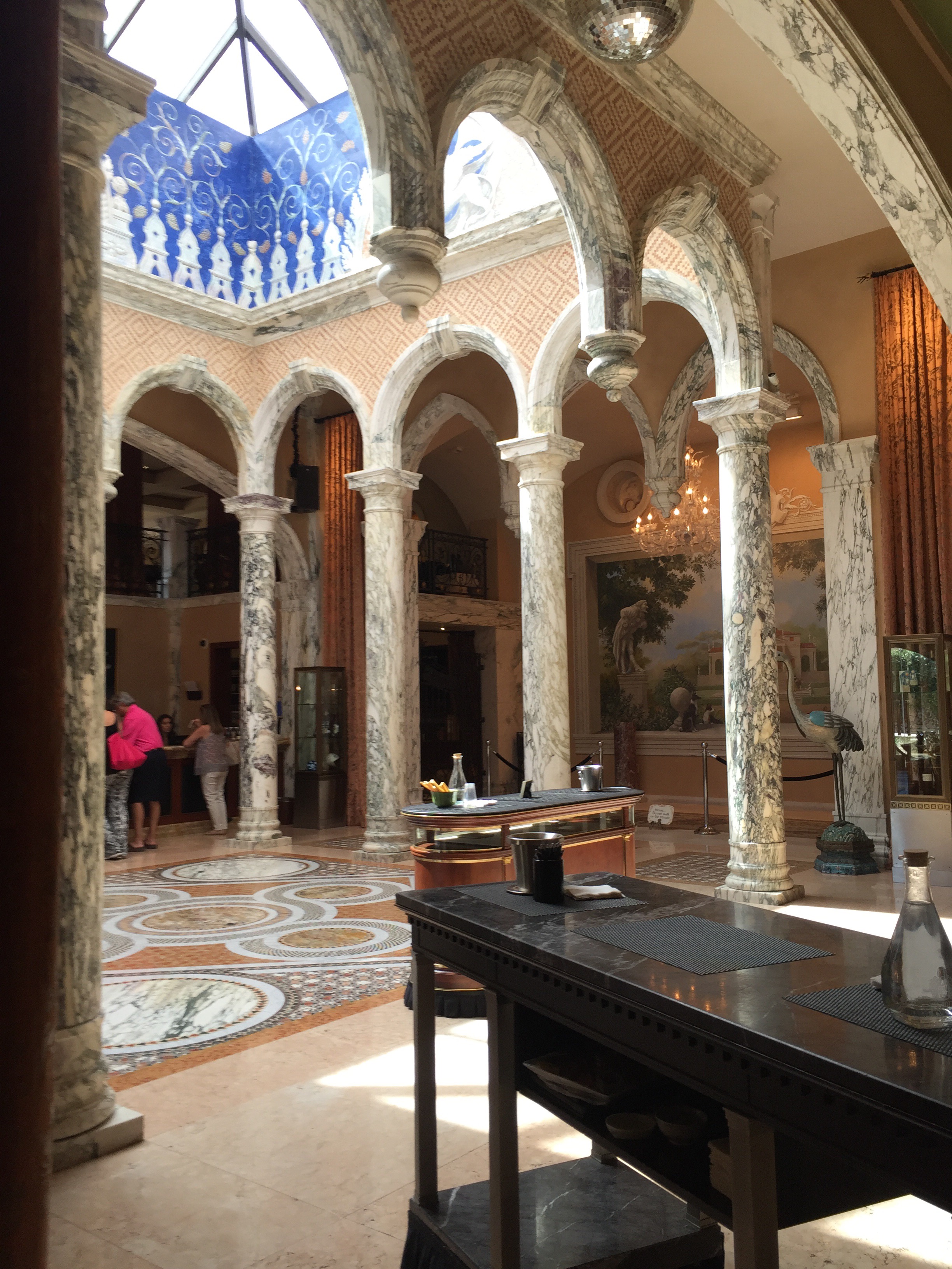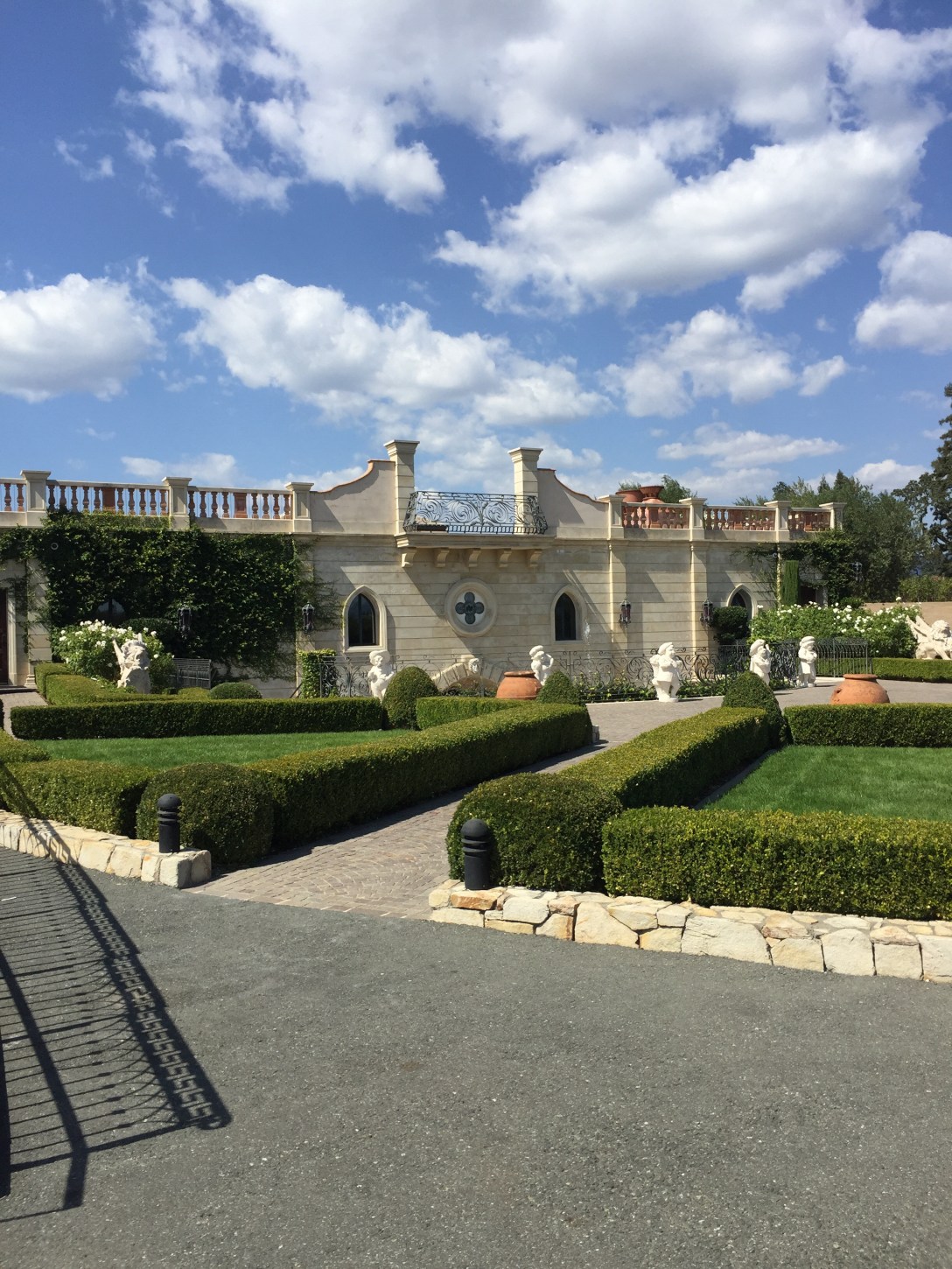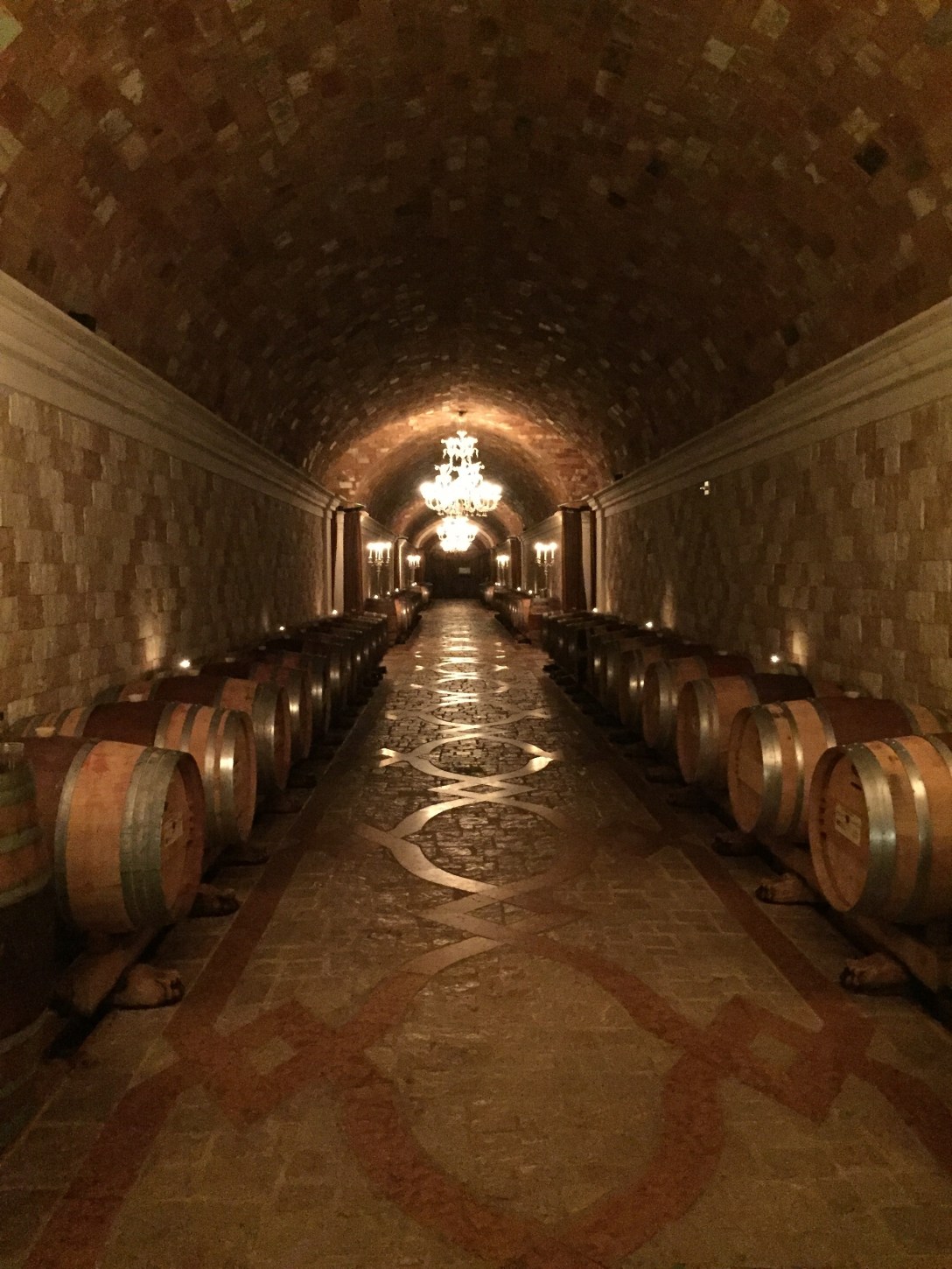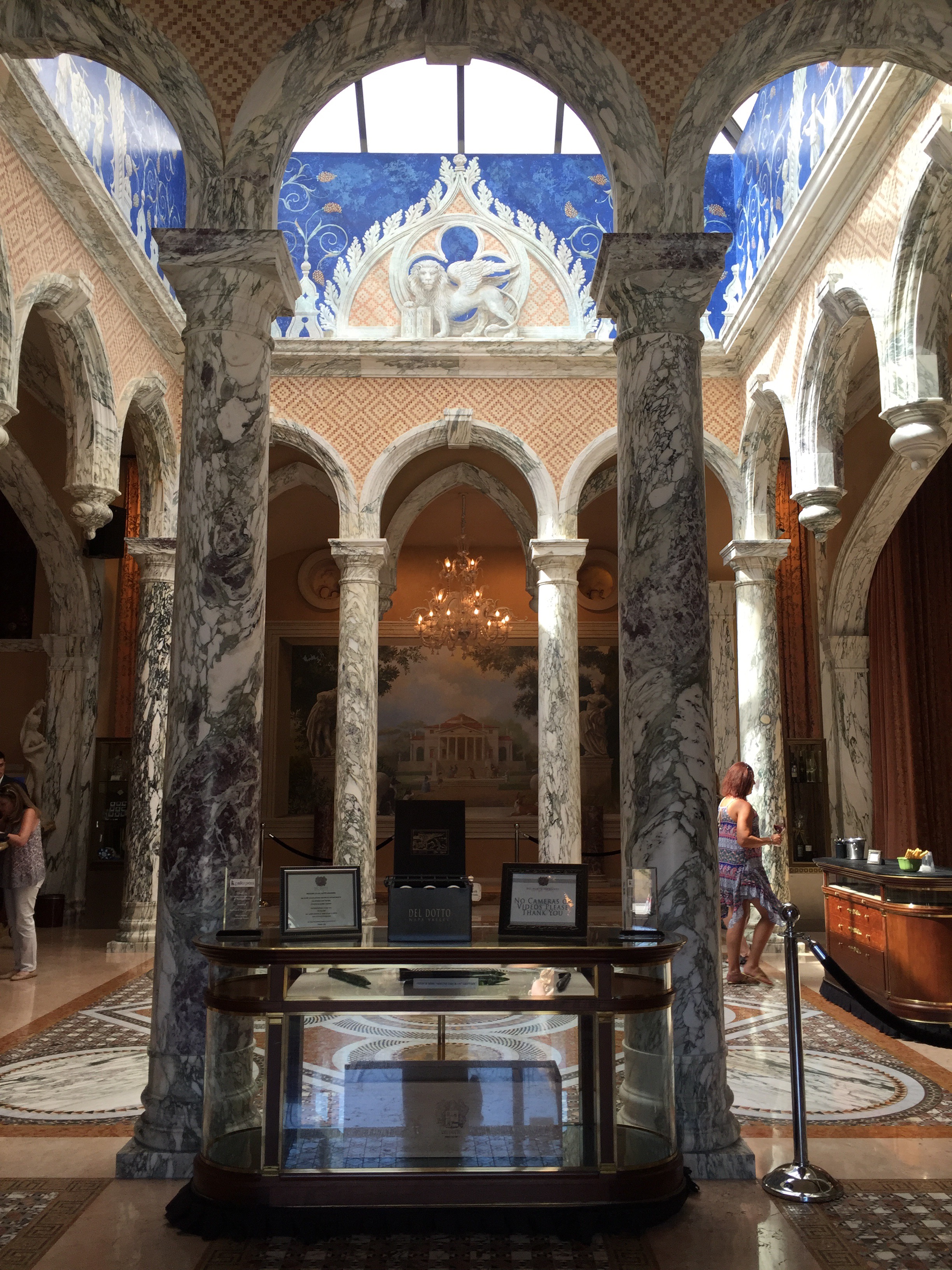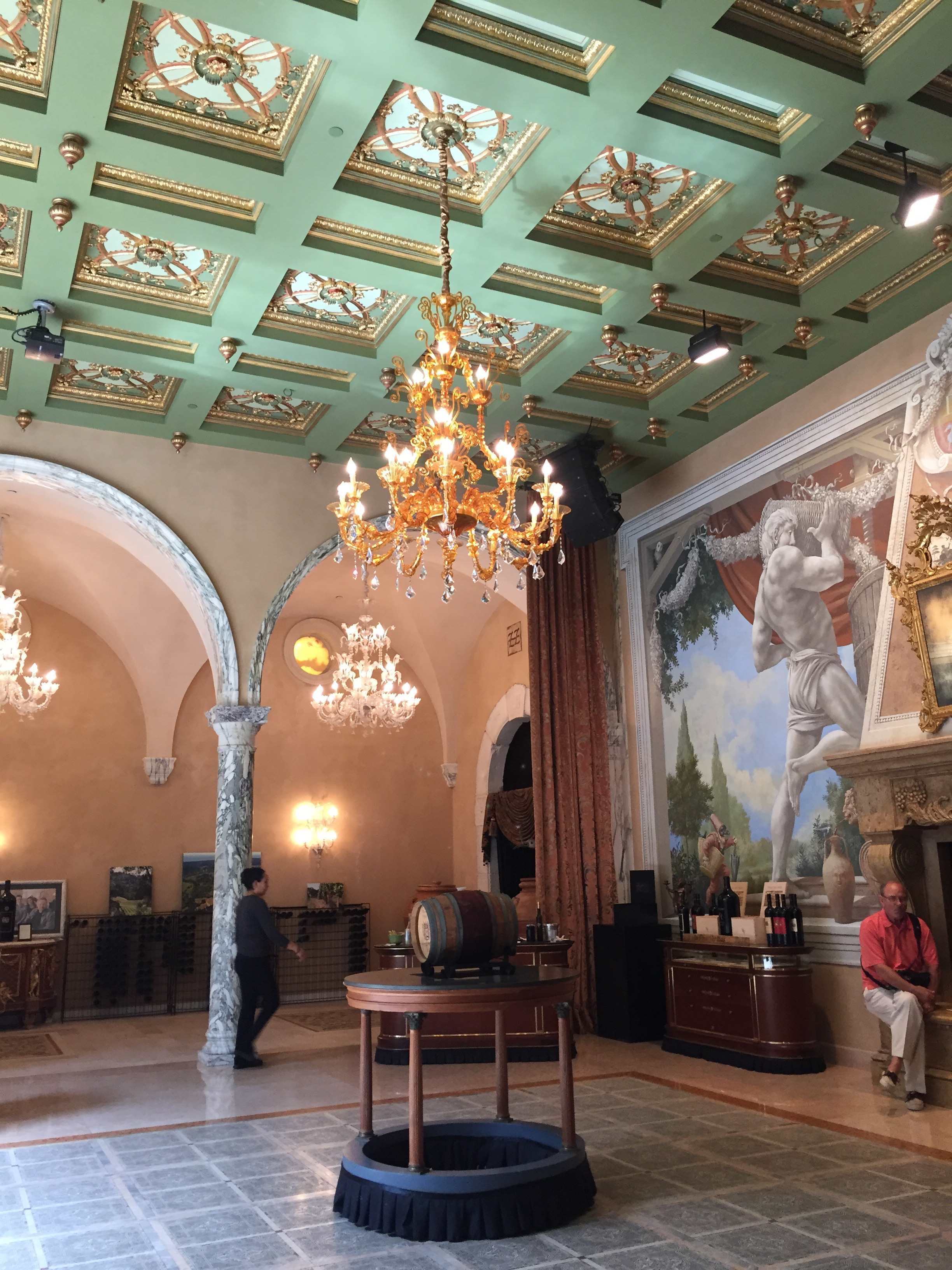 3:00 p.m.: Del Dotto Vineyards – we pull up to this European looking home which seems quite small, however as we continue walking towards it, it gets bigger – because the first floor is actually below ground. We enter and the entire place is filled with marble, colorful walls, and what looks like an Italian mansion. We then enter the caves for our wine tasting and learn about oak barrels and how the wood taken from specific woods can change the wine. We tried about six wines – all red and mainly cabernet. We then head back out of the caves and stand at a bar where we drink more wine and they provide cheese, prosciutto, and homemade pizza. So fun!